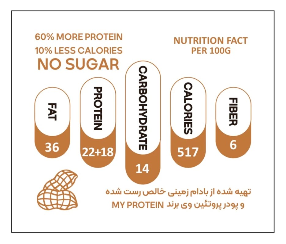 60٪ پروتئین بیشتر، تهیه شده از بادام زمینی خالص رست شده بدون شکر و روغن و پودرپروتئین برند my protein